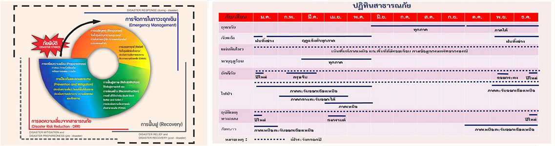 ระยะขณะเกิดภัย: การตอบสนองฉุกเฉิน (เช่น การค้นหาและช่วยชีวิต การปฐมพยาบาลและรักษาพยาบาลผู้บาดเจ็บ) ระยะหลังภัย: การฟื้นฟูและประเมินผลหลังเหตุการณ์ (เช่น การดูแลสุขภาพจิตผู้ประสบภัย และการฟื้นฟูระบบสาธารณสุขในพื้นที่)