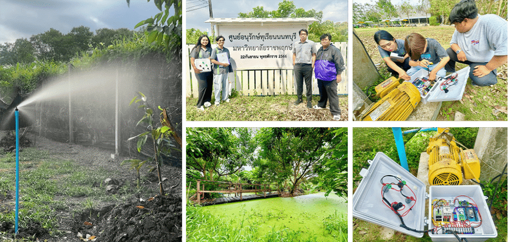 การพัฒนานวัตกรรมสิ่งประดิษฐ์เพื่อเป็นต้นแบบและแก้ไขปัญหาของเกษตรกรชุมชน ได้มีการพัฒนานวัตกรรมเกี่ยวกับการทำเกษตรพืชเศรษฐกิจสำคัญ (สวนทุเรียนนนท์) เพื่อแก้ไขปัญหาของการควบคุมระบบระบายน้ำ ไม่ให้เกิดความเสียหายกับสวนทุเรียน เมื่อเกิดสถานการณ์ภัยทางธรรมชาติ เช่น ฝนตกหนัก ปริมาณน้ำในลุ่มแม่น้ำเจ้าพระยามากเกินไป เนื่องจากพื้นที่เพาะปลูกส่วนใหญ่ในจังหวัดนนทบุรีเป็นพื้นที่ราบลุ่ม ทำให้เกิดความเสียหายแก่การปลูกพืชเศรษฐกิจสำคัญได้ (สวนทุเรียนนนท์) โดยมหาวิทยาลัยพัฒนาพื้นที่ดินรกร้างให้เป็นศูนย์อนุรักษ์ทุเรียนนนทบุรี มหาวิทยาลัยราชพฤกษ์ เพื่อเป็นพื้นที่ตัวอย่างในการทดลองนวัตกรรมสิ่งประดิษฐ์ และจากปัญหาเรื่องปริมาณน้ำในพื้นที่ปลูกมากเกินไป จึงได้พัฒนาระบบควบคุมการระบายน้ำอัตโนมัติ โดยการตรวจสอบจากระดับน้ำในพื้นที่เพาะปลูก ให้อยู่ในระดับที่เหมาะสม ไม่สร้างความเสียหายให้กับต้นทุเรียน ทำให้สามารถบริหารจัดการปริมาณน้ำในพื้นที่เพาะปลูกได้อย่างมีประสิทธิ์ภาพ
