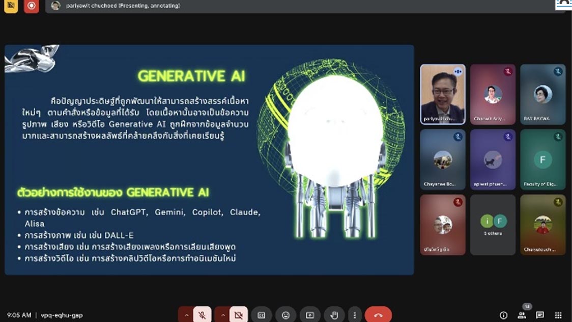 สำนักบริการวิชาการ ร่วมกับ คณะเทคโนโลยีดิจิทัล มหาวิทยาลัยราชพฤกษ์ ได้จัดกิจกรรมอบรมเชิงปฏิบัติการในรูปแบบออนไลน์ภายใต้หัวข้อเรื่อง Generative AI สำหรับการทำงาน เมื่อวันที่ 23 พฤษภาคม 2568 โดยมีผู้เข้าร่วมจำนวน 11 คน ประกอบด้วยบุคลากรจากหลากหลายสาขาอาชีพที่มีความสนใจในการประยุกต์ใช้เทคโนโลยี AI เพื่อเพิ่มประสิทธิภาพในการทำงาน เมื่อวันที่ 23 พฤษภาคม 2568 ในรูปแบบออนไลน์