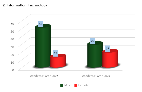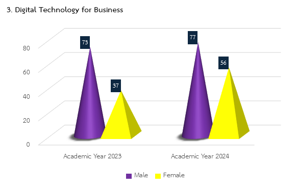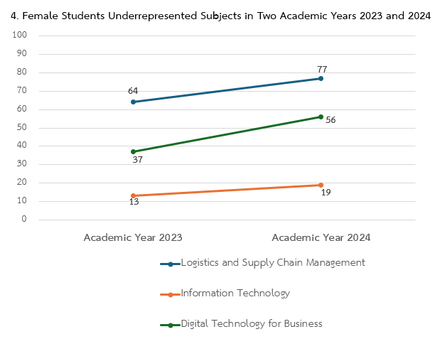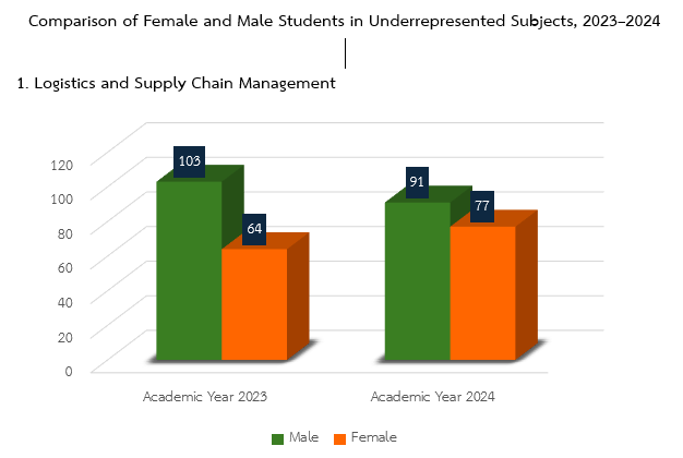 Rajapruk University actively promotes women’s participation in academic fields where they are underrepresented, such as Logistics and Supply Chain Management, Information Technology, and Digital Technology for Business. The university conducts outreach to vocational colleges and supports applicants and students through scholarships, the Student Loan Fund, and on-campus employment opportunities. Female students also receive mentoring, career guidance, and industry-based internships through partnerships with local communities and private-sector organizations. Flexible online learning further supports women who balance study with work responsibilities. As a result, female enrolment increased in 2024: Logistics and Supply Chain Management by 20.31%, Information Technology by 46.15%, and Digital Technology for Business by 51.35%.