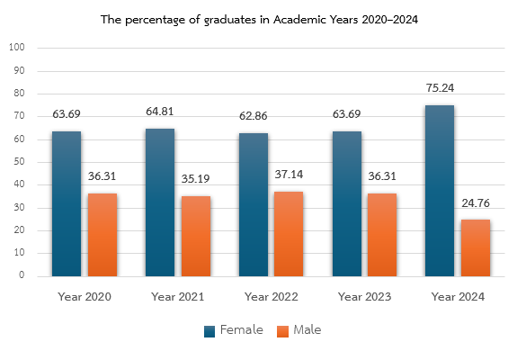 Rajapruk University systematically tracks student graduation outcomes, with the Office of Academic Affairs and Educational Standards compiling and analyzing graduation data from 2020–2024. When disaggregated by sex, female students consistently demonstrate a graduation rate approximately 50 percent higher than that of male students.